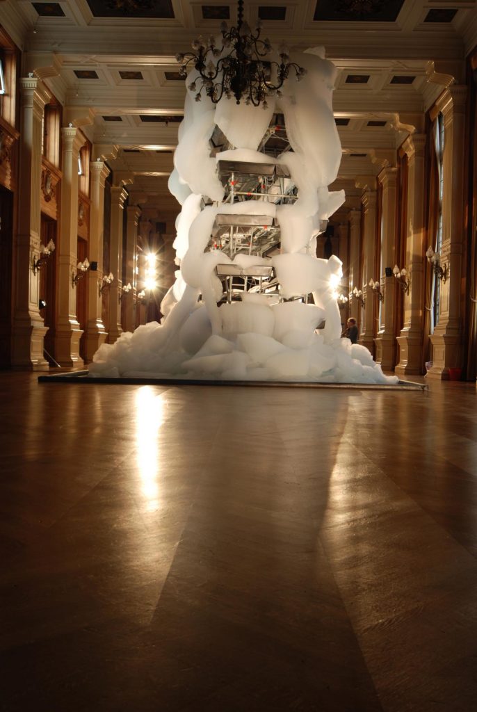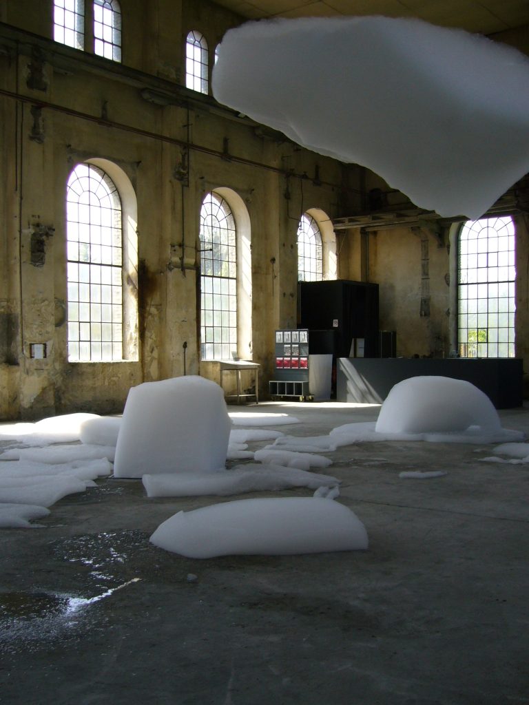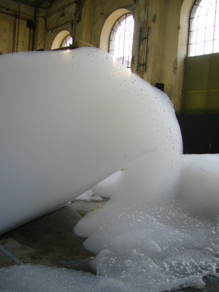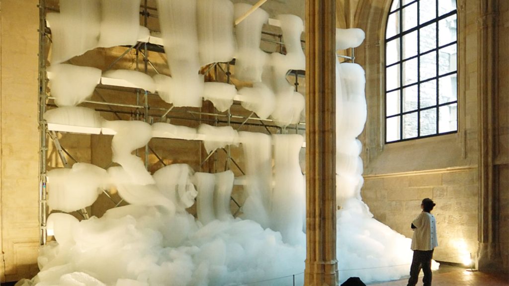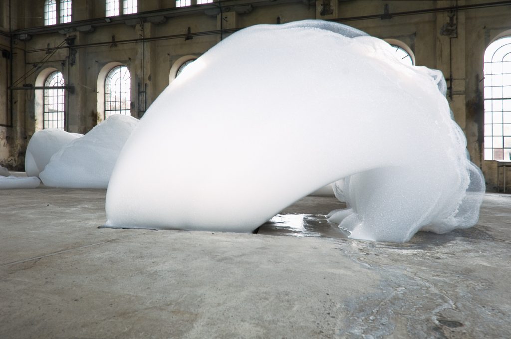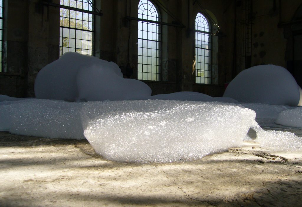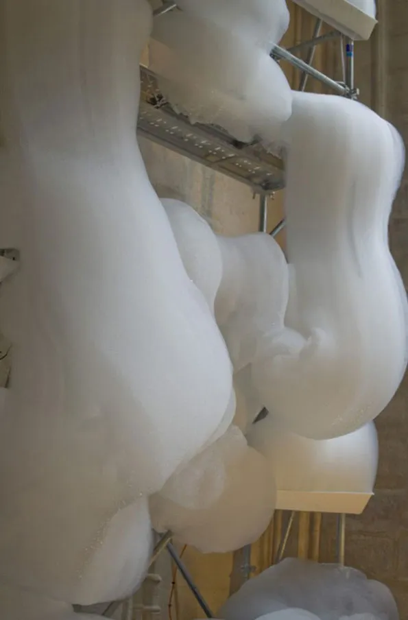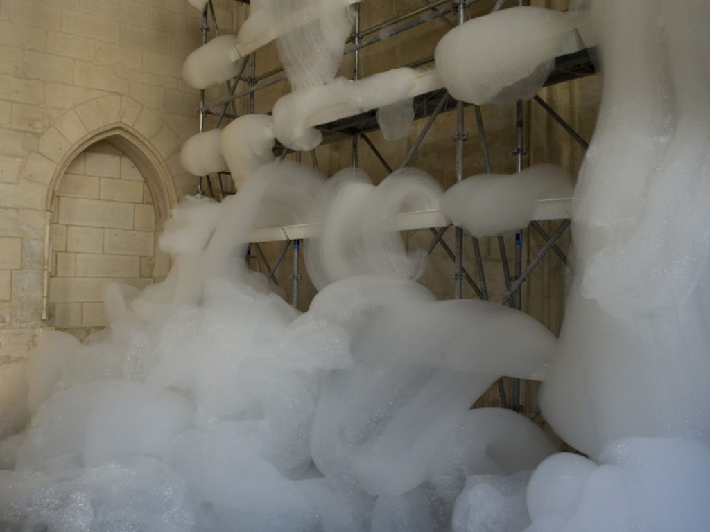 這是一個美妙、奇幻和巨大的肥皂泡雕塑:瀑布般的泡沫緩慢而不斷地從一個4.5米高的金屬腳手架上吐出並落下,最終消逝在地板上。泡沫會堆積,變形和破裂,發出細微的聲響,並逐漸被新產生泡沫所取代,而修道院內部古老的石柱、拱門和冷峻的氛圍無疑增強了整個奇觀。其結果是,肥皂泡沫的廉價可及性與修道院空間的宏偉性進行了對比,濕潤流動的泡沫為抽象的繪畫創造了框架。