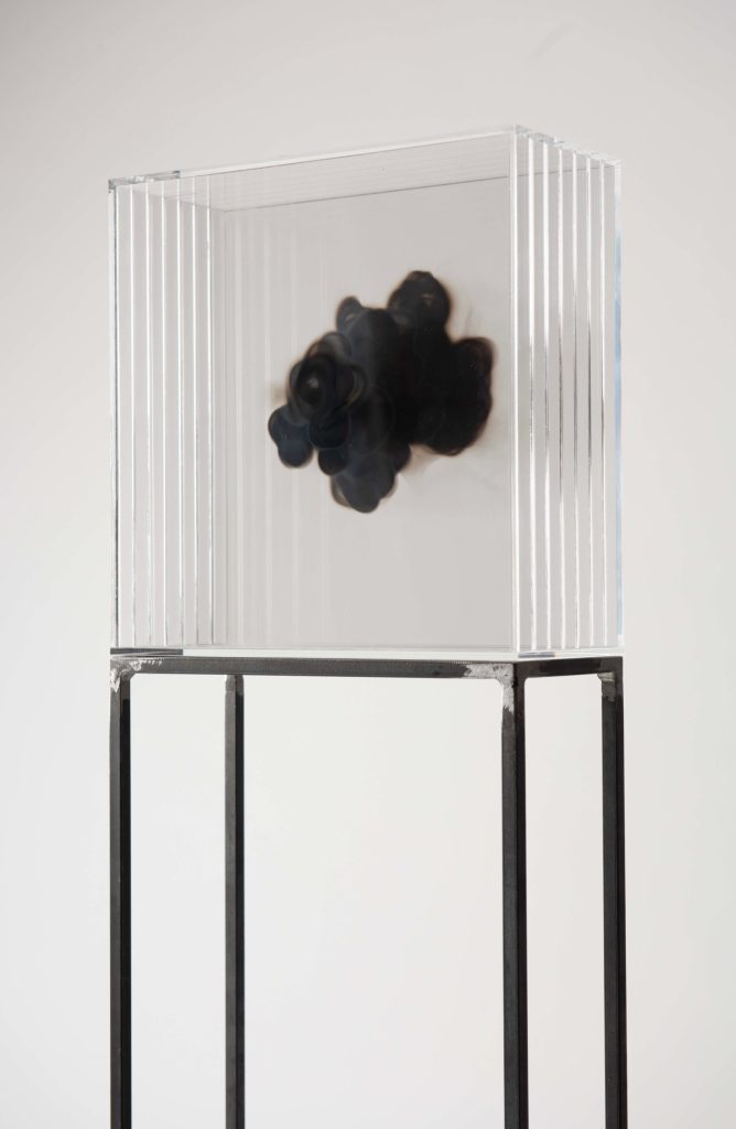 稍縱即逝的固體形態波動著,就好像昆蟲標本一樣被保存在一個個透明的外殼中。通過在數層透明的材料上用炭灰進行繪畫,Vega將一次變形框定為一樽雕塑,為抽象現象賦予了物理形態。