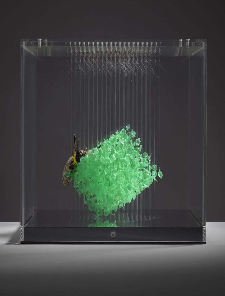 Morgan在玻璃櫃中打造的靜物避難所,使人想到動物的美麗和人類的破壞性:動物和塑料的結合暗指大規模滅絕和氣候危機;一些有機元素,如種子,在動物周圍形成優雅的形狀,暗示著時間的流逝。
