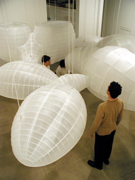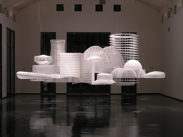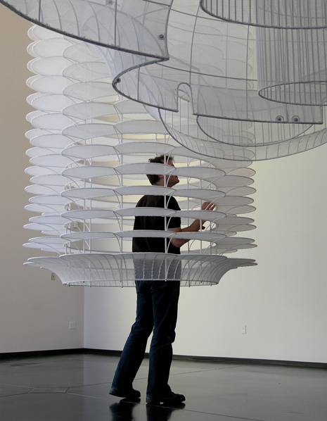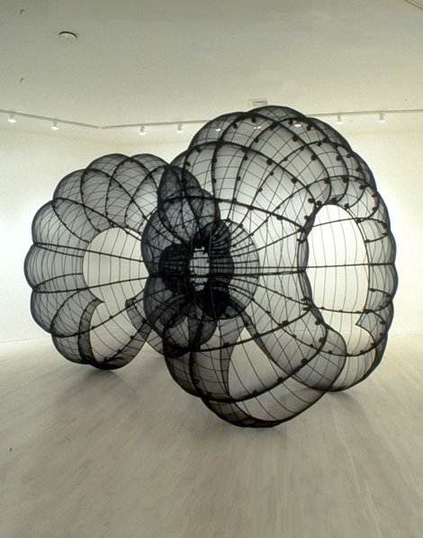 她的作品介於雕塑與建築之間,通常是由包裹在金屬骨架上的膜製成的非永久性複雜框架。其高大的內部空間是可以看到的,因此你可以想象自己站在它中間。它也是一個活躍的物體:你的眼睛最輕微的移動都會改變它蕾絲狀重疊的摩爾紋,它可能靜止不動,但似乎又在寂靜中永久移動著。