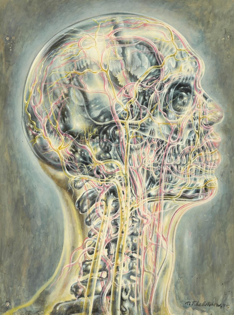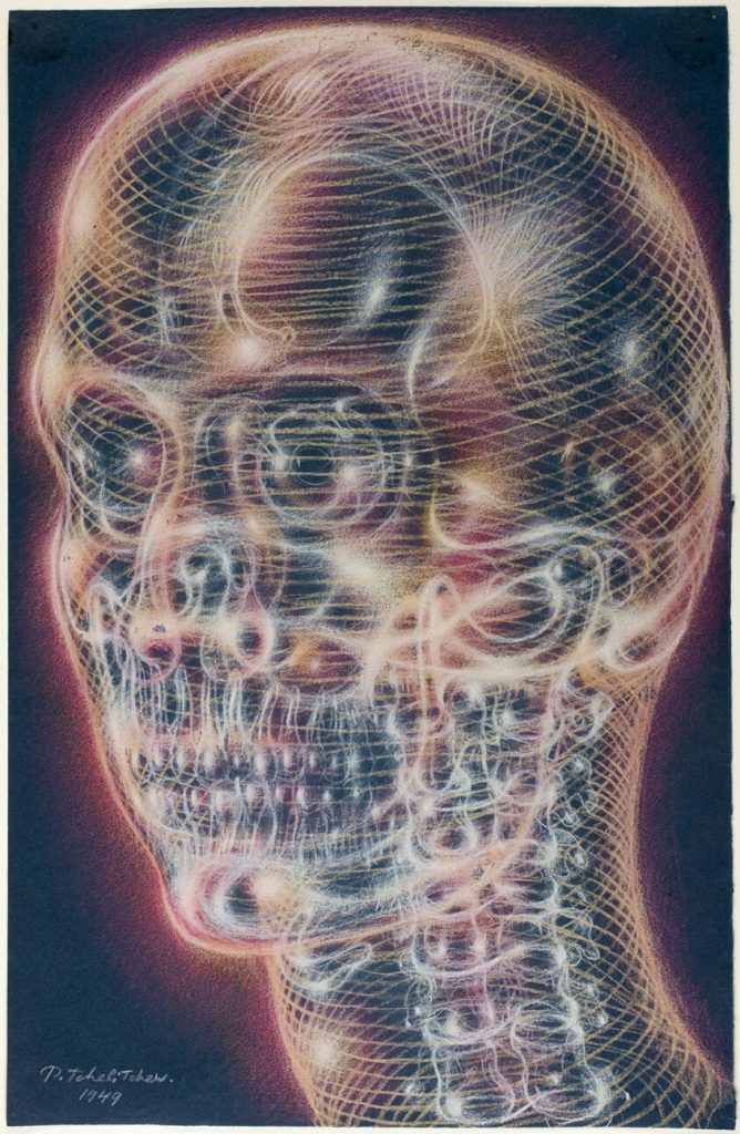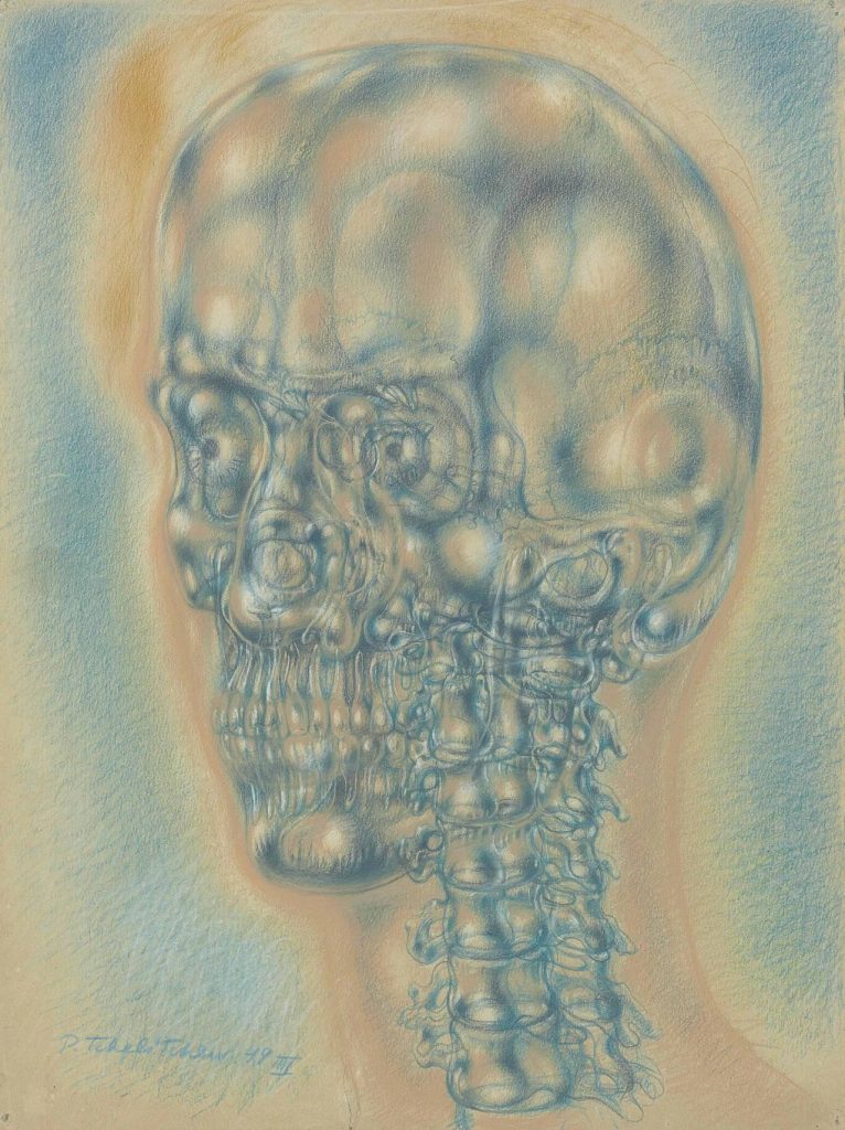 Pavel Tchelitchew是一位設計師、芭蕾舞演員和藝術家。他喜歡描繪人類的頭骨並展現其內部,這種超現實的透明頭骨具有明亮和準確的神經和肌肉輪廓。